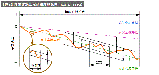 *導(dǎo)程精度:絲母的有效移動(dòng)距離或者絲杠的有效螺紋長度累積代表導(dǎo)程誤差及變動(dòng),或者,導(dǎo)程誤差螺紋全長內(nèi)任意300mm的變動(dòng)值或螺紋有效長度內(nèi)任意一點(diǎn)旋轉(zhuǎn)一周變動(dòng)做出的規(guī)定(【圖1】)。在【表1】【表2】列出了其允許值。